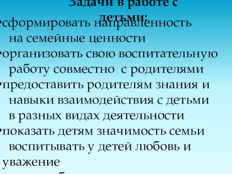 Задачи в работе с детьми:сформировать направленность на семейные ценности организовать свою воспитательную  работу совместно с