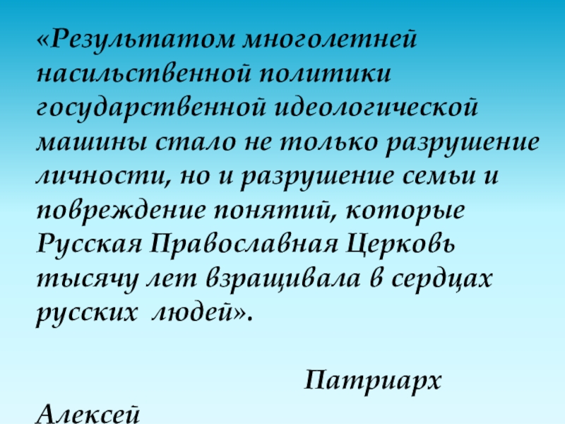 «Результатом многолетней насильственной политики государственной идеологической машины стало не только разрушение личности, но и разрушение семьи и повреждение понятий, которые Русская Православная Церковь тысячу лет взращивала в сердцах русских людей».