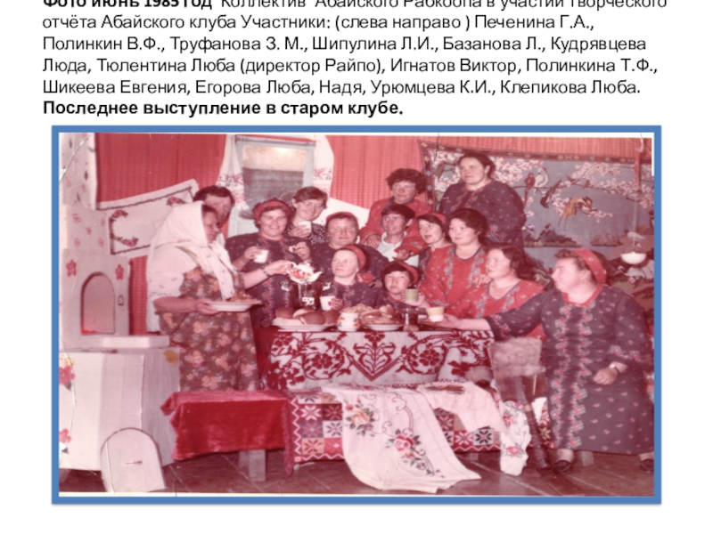 Абайского клуба Участники: (слева направо ) Печенина Г.А., Полинкин В.Ф., Труфанова З. М., Шипулина Л.И., Базанова Л., Кудрявцева Люда, Тюлентина Люба (директор Райпо), Игнатов Виктор, Полинкина Т.Ф., Шикеева Евгения, Егорова Люба, Надя, Урюмцева К.И., Клепикова Люба. Последнее выступление в старом клубе.
