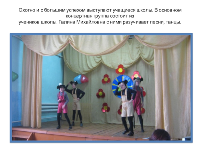 Слайд 32Охотно и с большим успехом выступают учащиеся школы. В основном концертная