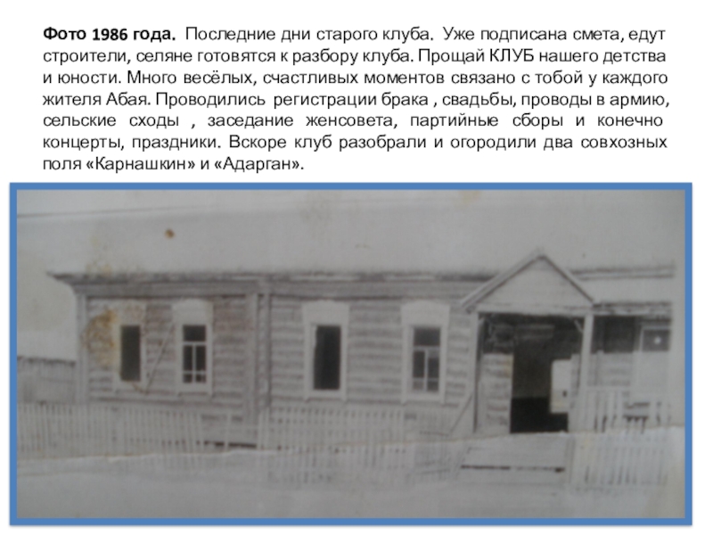 строители, селяне готовятся к разбору клуба. Прощай КЛУБ нашего детства и юности. Много весёлых, счастливых моментов связано с тобой у каждого жителя Абая. Проводились регистрации брака , свадьбы, проводы в армию, сельские сходы , заседание женсовета, партийные сборы и конечно концерты, праздники. Вскоре клуб разобрали и огородили два совхозных поля «Карнашкин» и «Адарган».