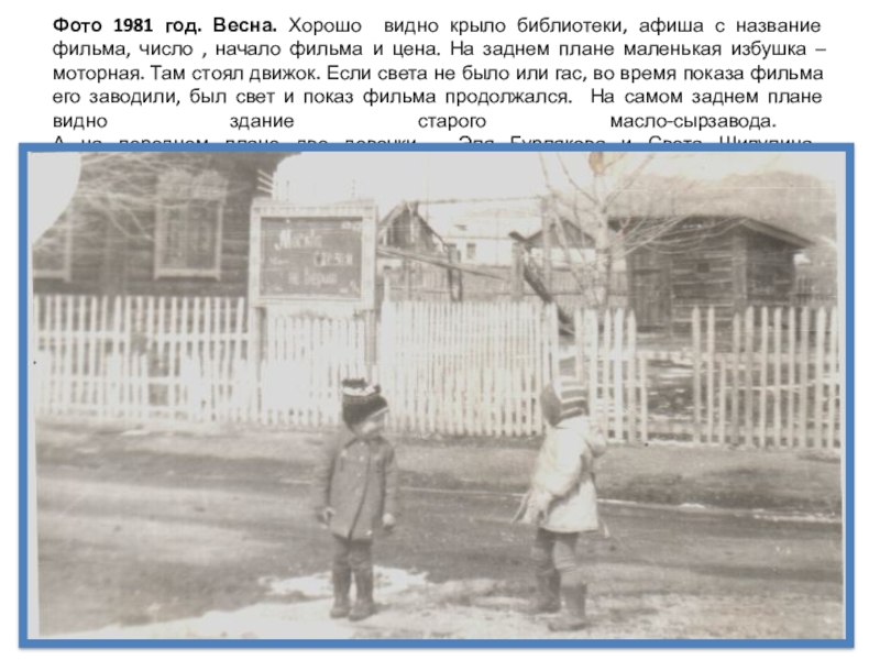 фильма, число , начало фильма и цена. На заднем плане маленькая избушка – моторная. Там стоял движок. Если света не было или гас, во время показа фильма его заводили, был свет и показ фильма продолжался. На самом заднем плане видно здание старого масло-сырзавода.