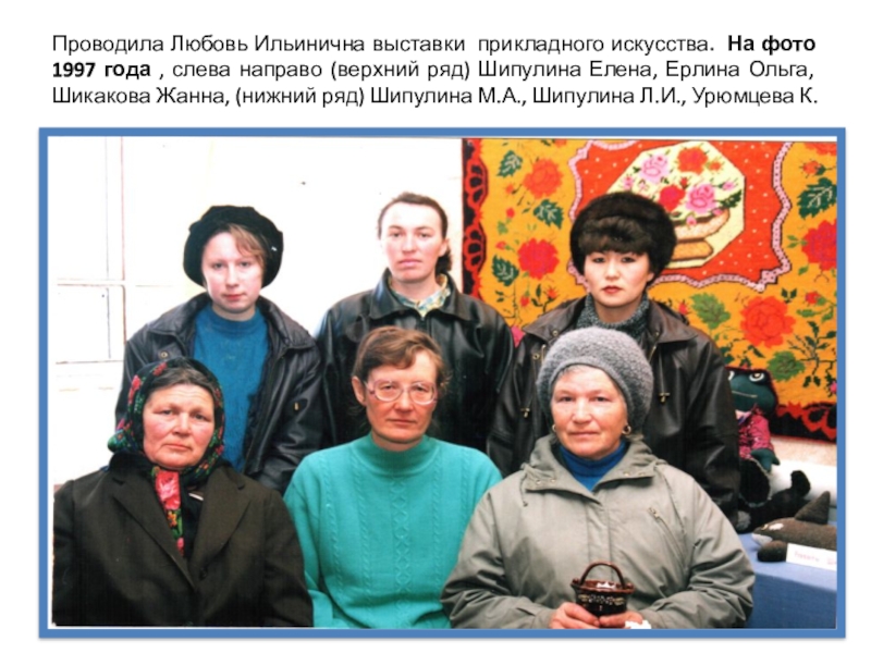 Слайд 27Проводила Любовь Ильинична выставки прикладного искусства. На фото 1997 года ,