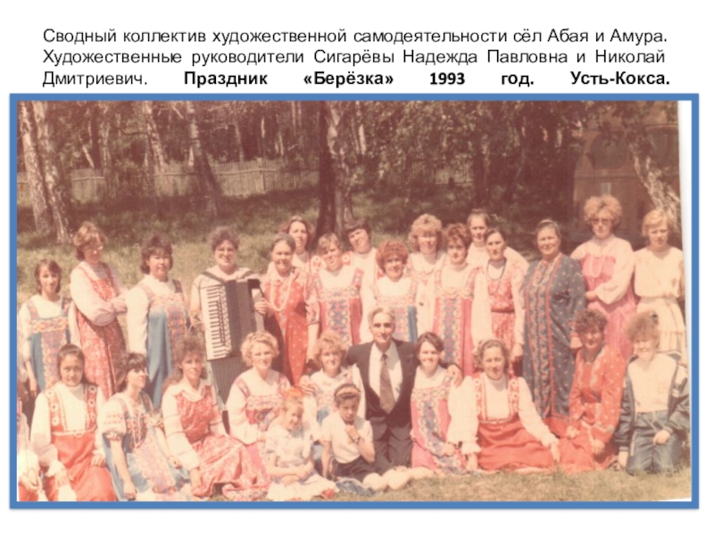 Слайд 21Сводный коллектив художественной самодеятельности сёл Абая и Амура. Художественные руководители Сигарёвы