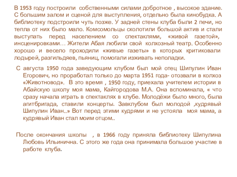 С августа 1950 года заведующим клубом был мой отец Шипулин Иван Егорович, но проработал только до марта 1951 года- отозвали в колхоз «Животновод». В это время , 1950 году, приехала учителем истории в Абайскую школу моя мама, Кайгородова М.А. Она вспоминала, « что сразу начала играть в спектаклях в клубе. Молодёжи было много, была агитбригада, ставили концерты. Завклубом был молодой ,кудрявый Шипулин Иван..» Вот перед этими кудрями и не устояла моя мама, а кудрявый Иван стал моим отцом..