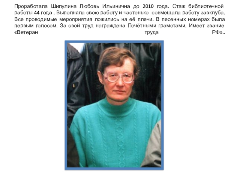 Слайд 28Проработала Шипулина Любовь Ильинична до 2010 года. Стаж библиотечной работы 44