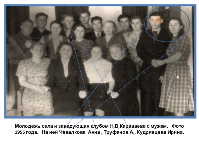 Слайд 3Молодёжь села и заведующая клубом Н,В,Караваева с мужем. Фото 1955