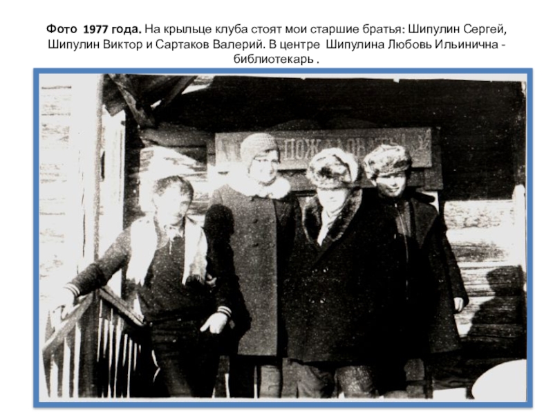 Слайд 8Фото 1977 года. На крыльце клуба стоят мои старшие братья: Шипулин