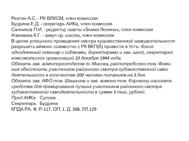 В целях успешного проведения смотра художественной самодеятельности разрешить аймоно совместно с РК ВКП(б) провести в Усть- Коксе однодневный семинар с избачами, директорами и зав. школ, секретарей комсомольских организаций 10 декабря 1944 года.