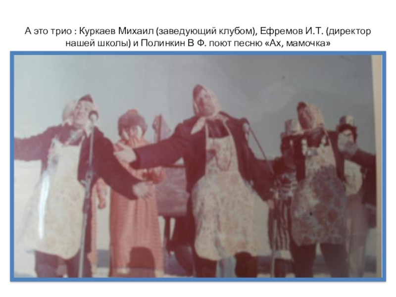 Слайд 23А это трио : Куркаев Михаил (заведующий клубом), Ефремов И.Т. (директор
