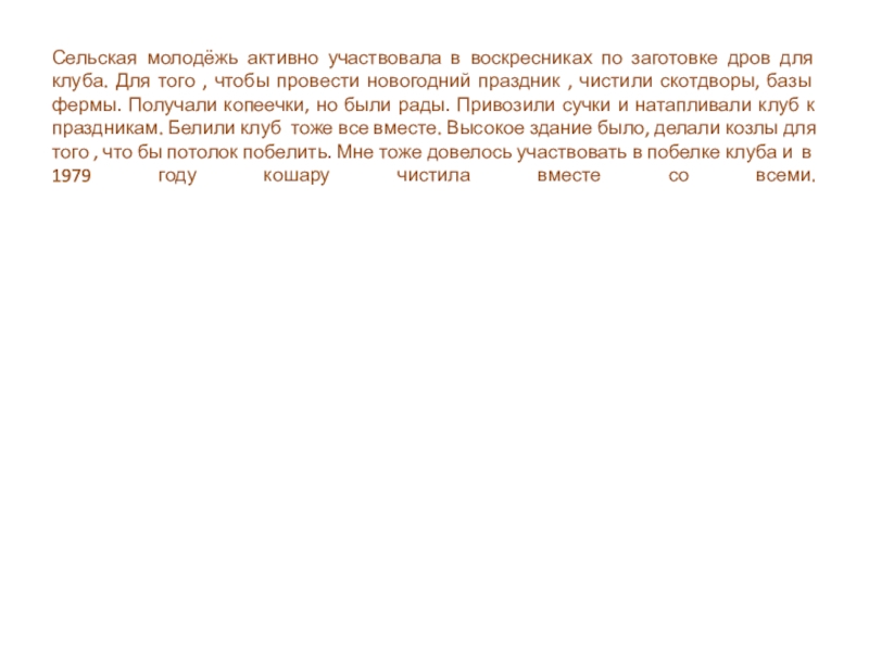 Для того , чтобы провести новогодний праздник , чистили скотдворы, базы фермы. Получали копеечки, но были рады. Привозили сучки и натапливали клуб к праздникам. Белили клуб тоже все вместе. Высокое здание было, делали козлы для того , что бы потолок побелить. Мне тоже довелось участвовать в побелке клуба и в 1979 году кошару чистила вместе со всеми.