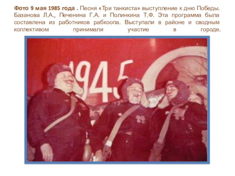 Слайд 15Фото 9 мая 1985 года . Песня «Три танкиста» выступление к