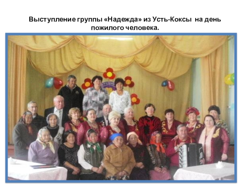 Слайд 30Выступление группы «Надежда» из Усть-Коксы на день пожилого человека.