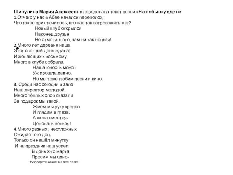 Шипулина Мария Алексеевна переделала текст песни «На побывку едет»: