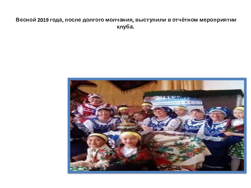 Слайд 33Весной 2019 года, после долгого молчания, выступили в отчётном мероприятии клуба.