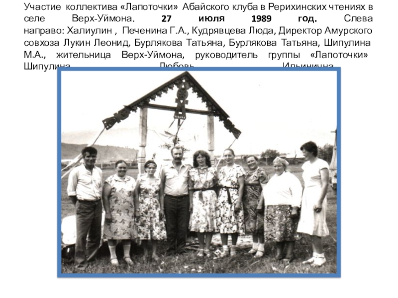 направо: Халиулин , Печенина Г.А., Кудрявцева Люда, Директор Амурского совхоза Лукин Леонид, Бурлякова Татьяна, Бурлякова Татьяна, Шипулина М.А., жительница Верх-Уймона, руководитель группы «Лапоточки» Шипулина Любовь Ильинична.