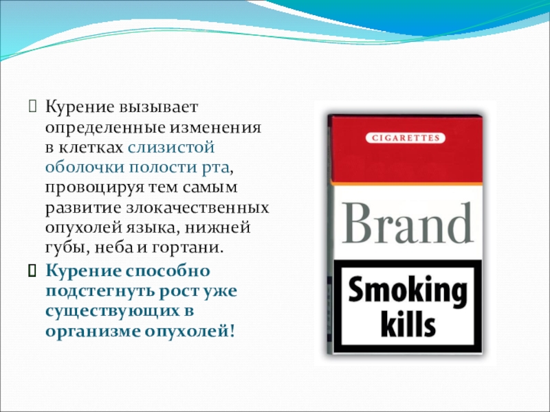 Слайд 13Курение вызывает определенные изменения в клетках слизистой оболочки полости рта, провоцируя