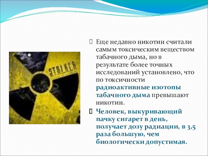 результате более точных исследований установлено, что по токсичности радиоактивные изотопы табачного дыма превышают никотин.