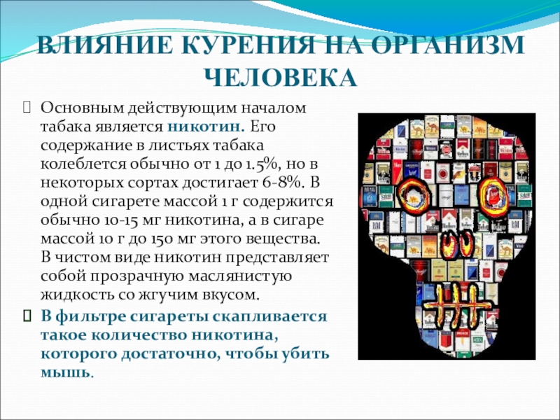 Слайд 7ВЛИЯНИЕ КУРЕНИЯ НА ОРГАНИЗМ ЧЕЛОВЕКА