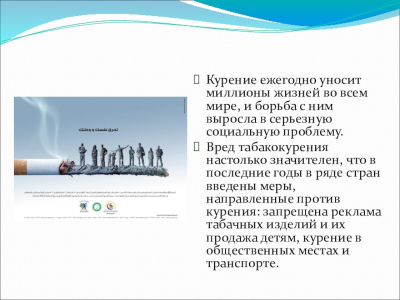 Вред табакокурения настолько значителен, что в последние годы в ряде стран введены меры, направленные против курения: запрещена реклама табачных изделий и их продажа детям, курение в общественных местах и транспорте.