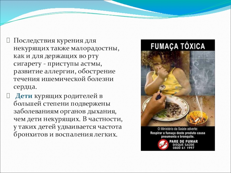 Слайд 19Последствия курения для некурящих также малорадостны, как и для держащих во