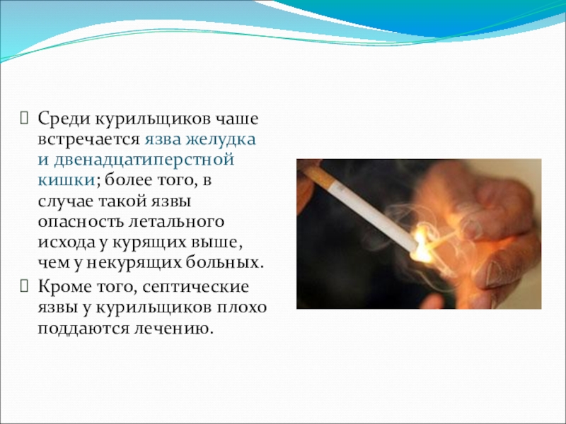Слайд 15Среди курильщиков чаше встречается язва желудка и двенадцатиперстной кишки; более того,