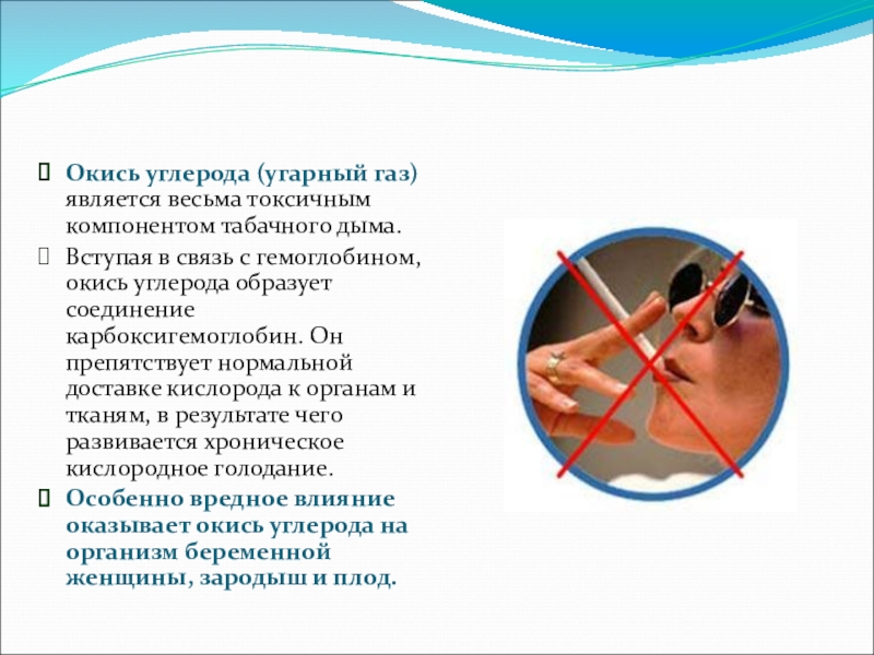 Особенно вредное влияние оказывает окись углерода на организм беременной женщины, зародыш и плод.