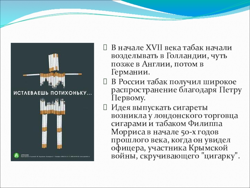 Слайд 4В начале XVII века табак начали возделывать в Голландии, чуть позже