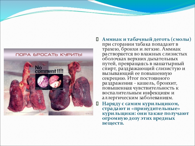 Слайд 10Аммиак и табачный деготь (смолы) при сгорании табака попадают в трахею,