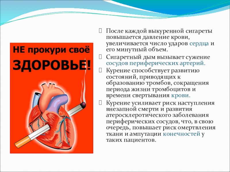 Курение усиливает риск наступления внезапной смерти и развития атеросклеротического заболевания периферических сосудов, что, в свою очередь, повышает риск омертвления ткани и ампутации конечностей у таких пациентов.