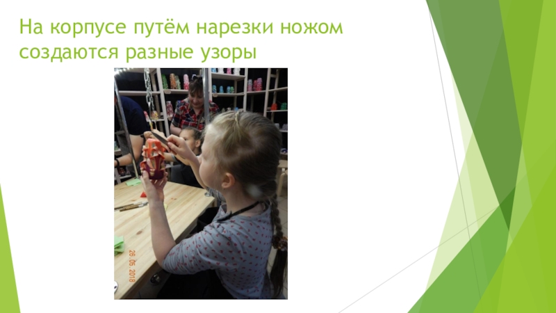 Слайд 9На корпусе путём нарезки ножом создаются разные узоры