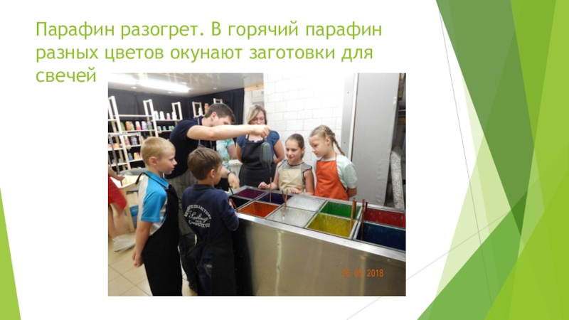 Слайд 4Парафин разогрет. В горячий парафин разных цветов окунают заготовки для свечей