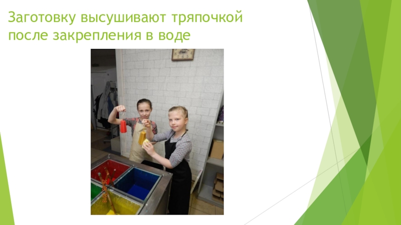 Слайд 7Заготовку высушивают тряпочкой после закрепления в воде