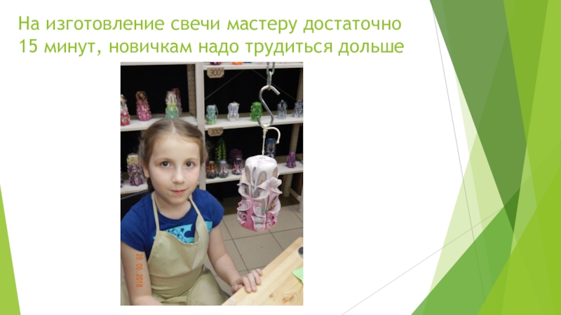 Слайд 12На изготовление свечи мастеру достаточно 15 минут, новичкам надо трудиться дольше