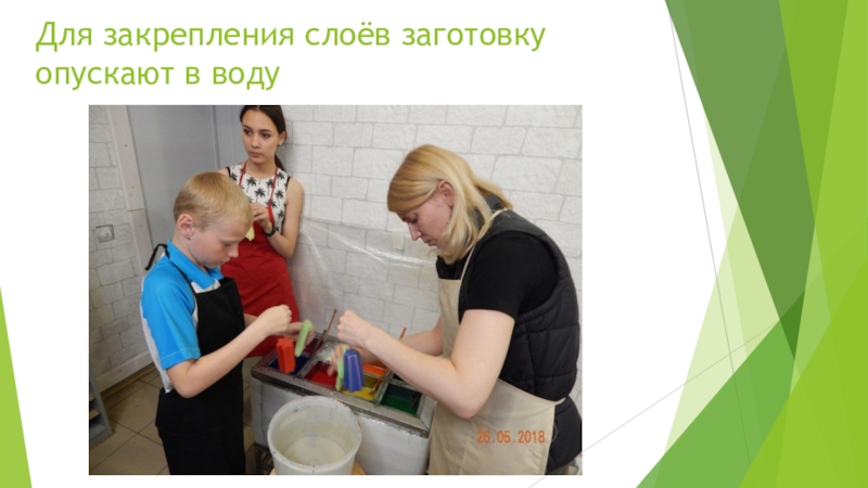 Слайд 6Для закрепления слоёв заготовку опускают в воду