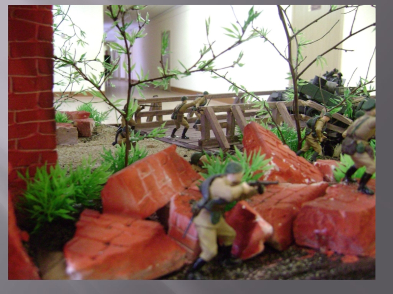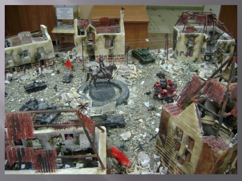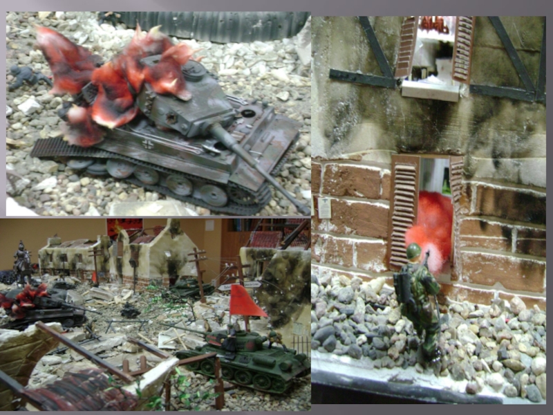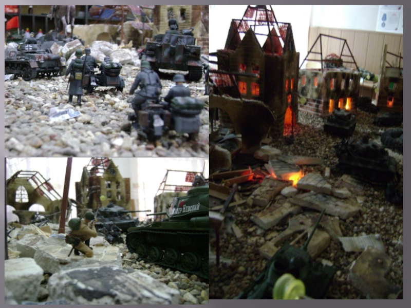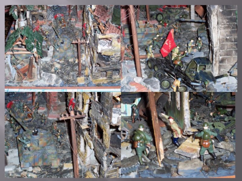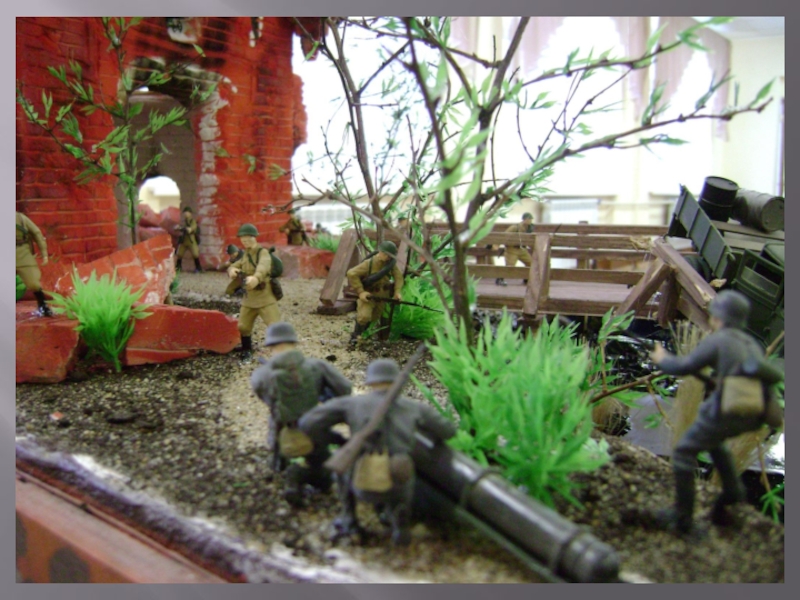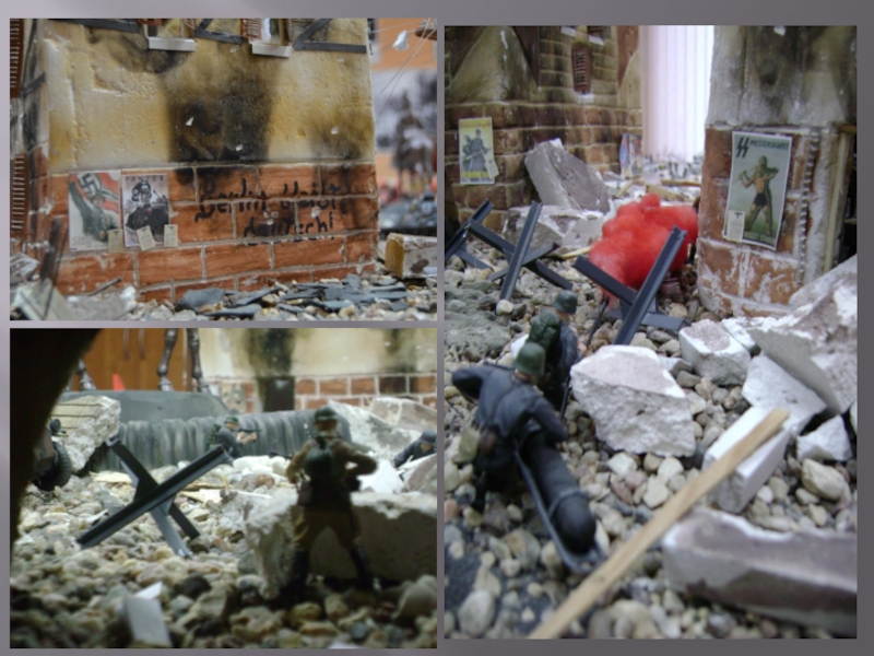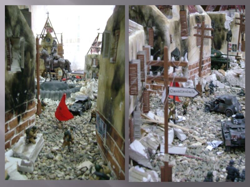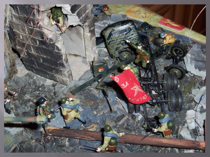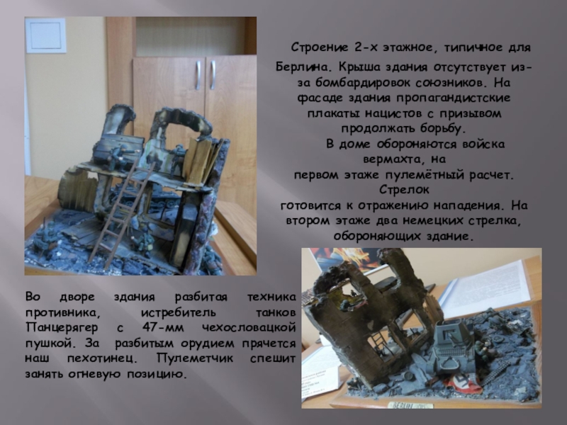 Во дворе здания разбитая техника противника, истребитель танков Панцерягер с 47-мм чехословацкой пушкой. За разбитым орудием прячется наш пехотинец. Пулеметчик спешит занять огневую позицию.