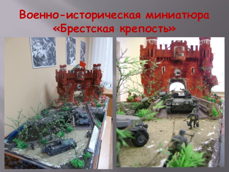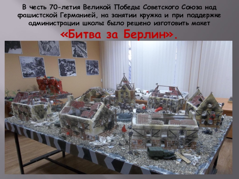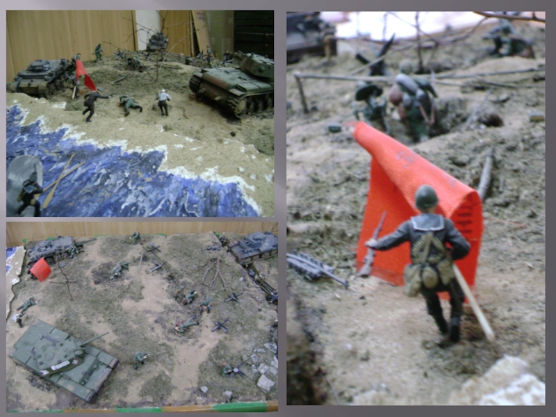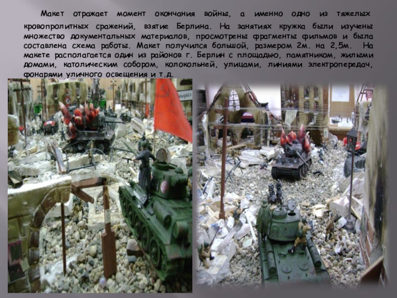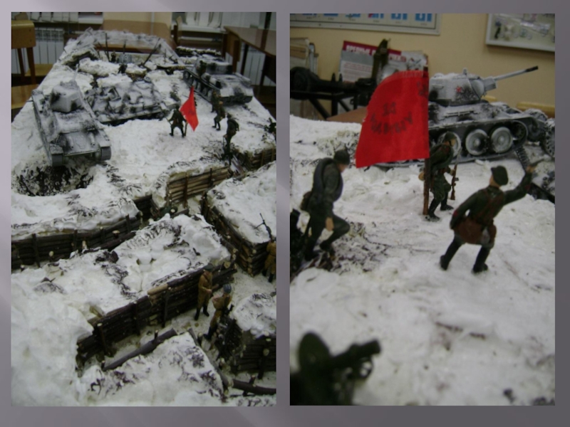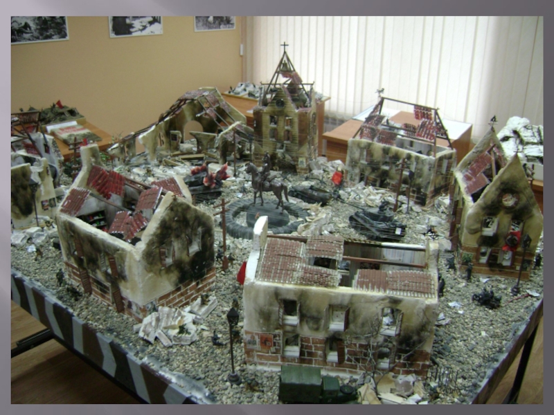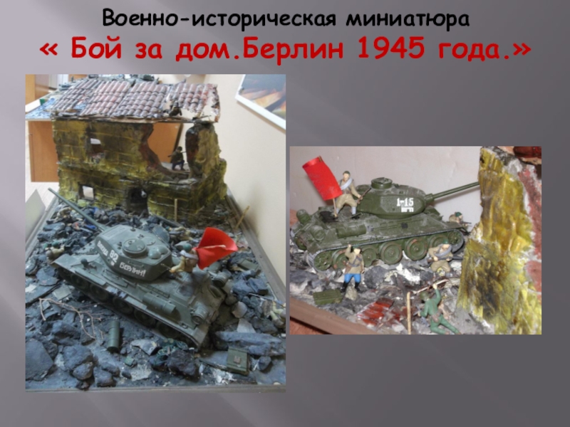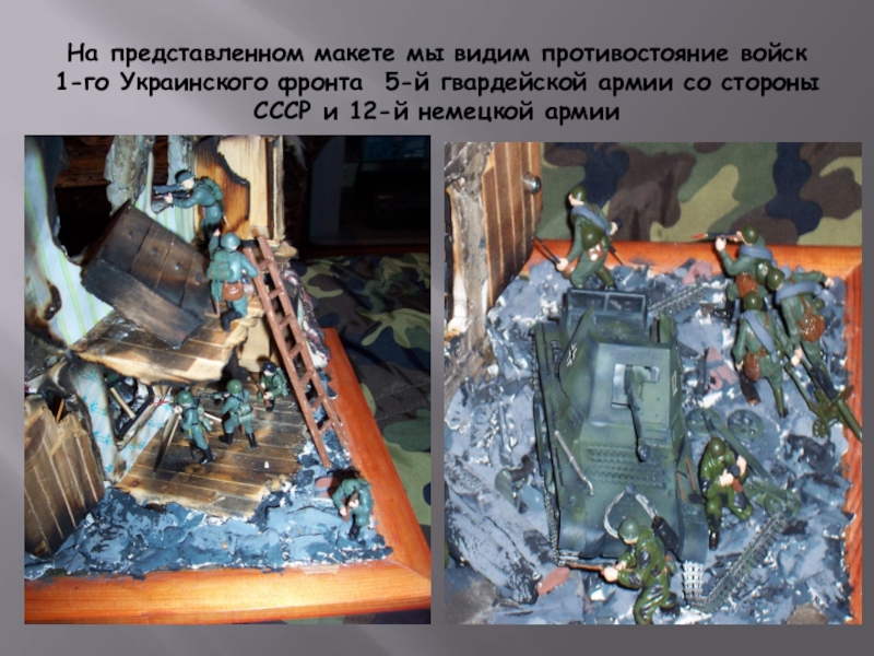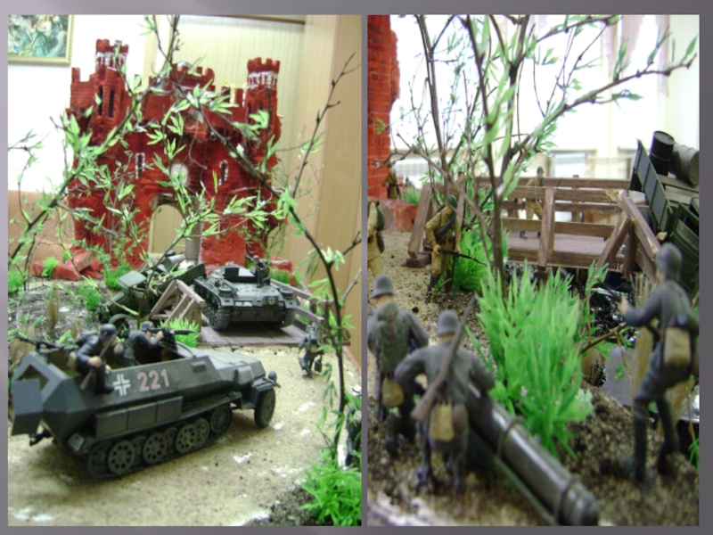 Во дворе здания разбитая техника противника, истребитель танков Панцерягер с 47-мм чехословацкой пушкой. За разбитым орудием прячется наш пехотинец. Пулеметчик спешит занять огневую позицию.