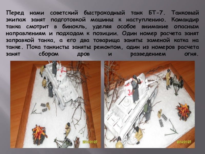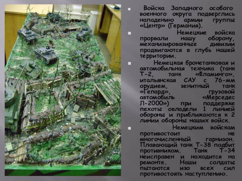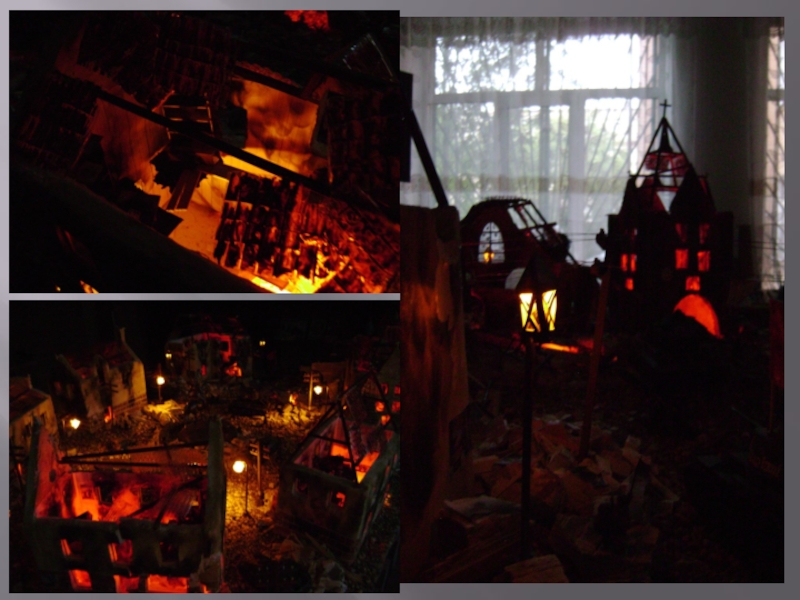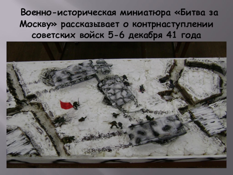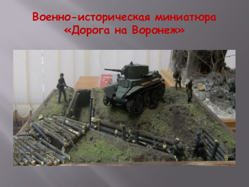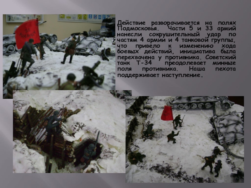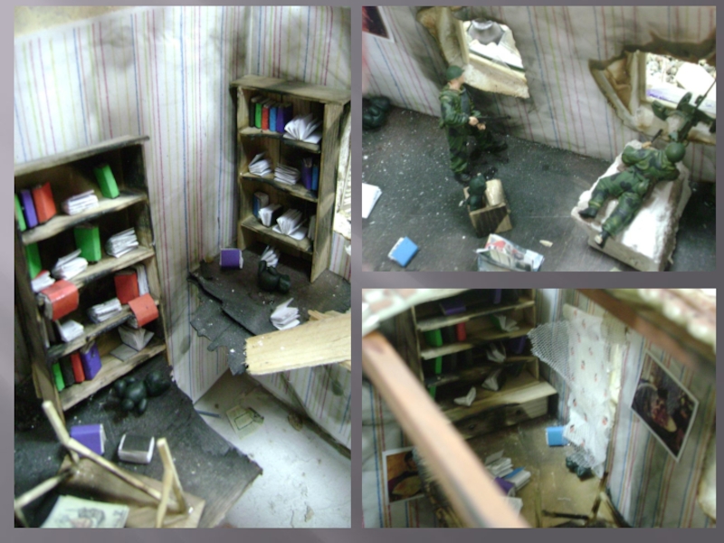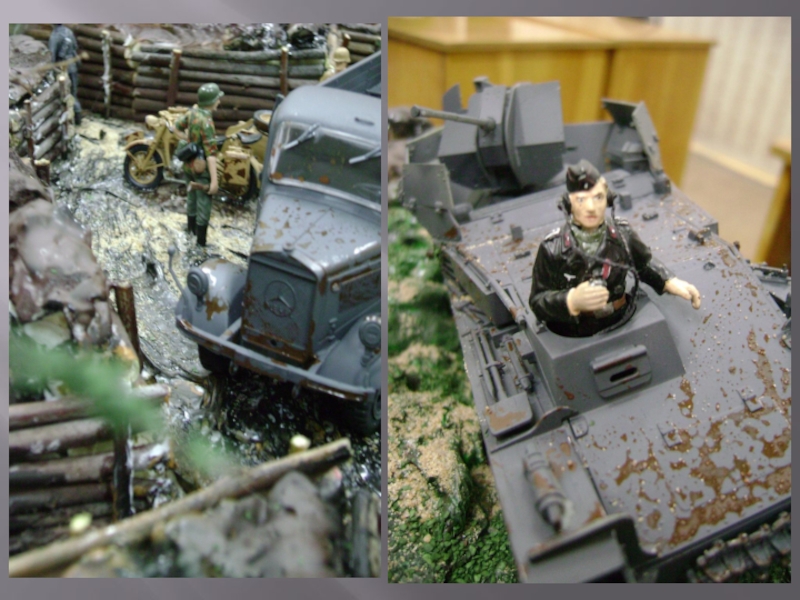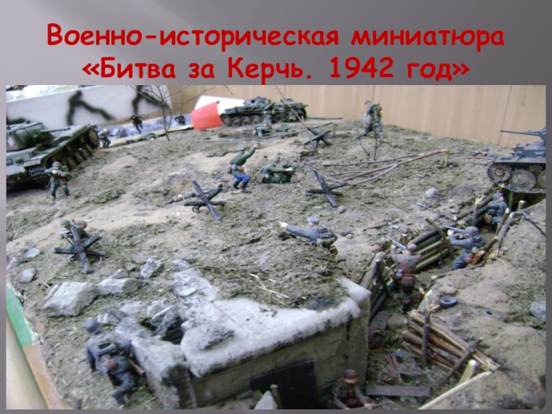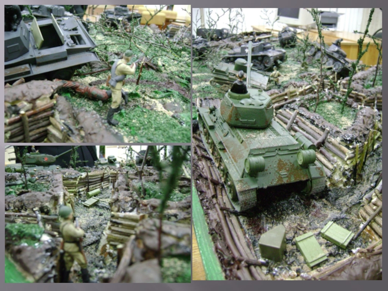 Во дворе здания разбитая техника противника, истребитель танков Панцерягер с 47-мм чехословацкой пушкой. За разбитым орудием прячется наш пехотинец. Пулеметчик спешит занять огневую позицию.