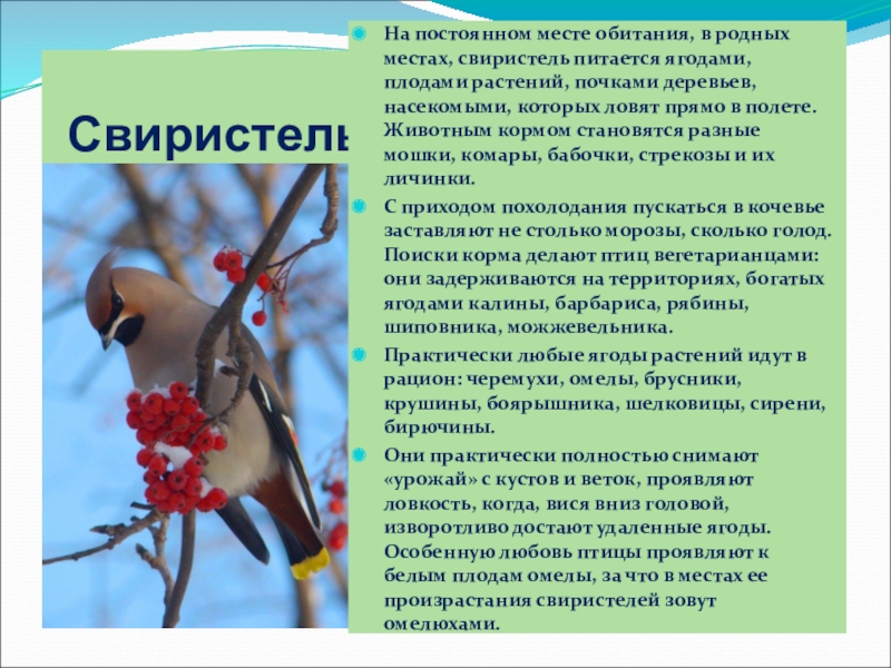 На постоянном месте обитания, в родных местах, свиристель питается ягодами, плодами