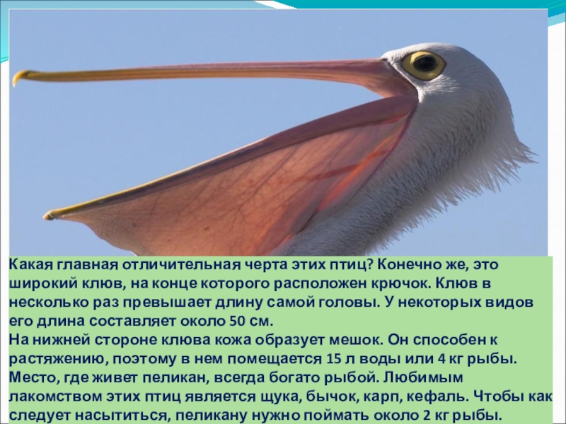 На нижней стороне клюва кожа образует мешок. Он способен к растяжению, поэтому в нем помещается 15 л воды или 4 кг рыбы.