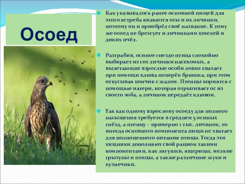 Как указывалось ранее основной пищей для этого ястреба являются осы и