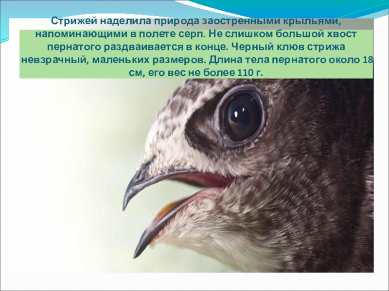 Слайд 9Стрижей наделила природа заостренными крыльями, напоминающими в полете серп. Не слишком