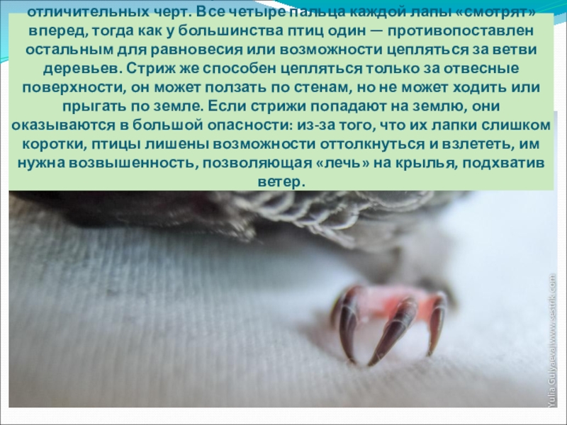 Слайд 10Пальцы на лапах черного стрижа тоже являются одной из отличительных черт.