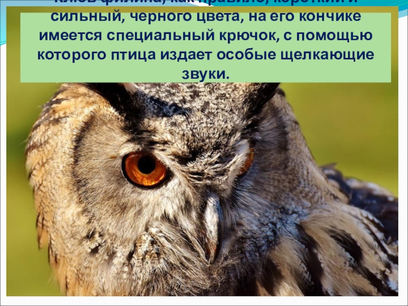 Слайд 7Клюв филина, как правило, короткий и сильный, черного цвета, на его