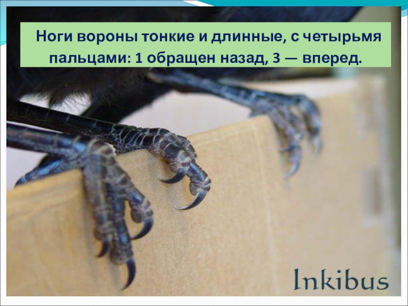 Ноги вороны тонкие и длинные, с четырьмя пальцами: 1 обращен