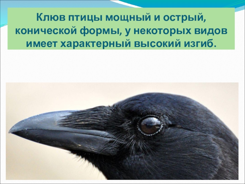 Слайд 13Клюв птицы мощный и острый, конической формы, у некоторых видов имеет