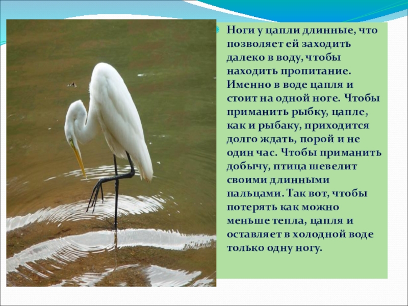 чтобы находить пропитание. Именно в воде цапля и стоит на одной ноге. Чтобы приманить рыбку, цапле, как и рыбаку, приходится долго ждать, порой и не один час. Чтобы приманить добычу, птица шевелит своими длинными пальцами. Так вот, чтобы потерять как можно меньше тепла, цапля и оставляет в холодной воде только одну ногу.