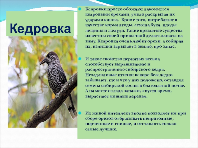 И такое свойство пернатых весьма способствует выращиванию и распространению сибирского кедра. Незадачливые птички вскоре бесследно забывают, где и что у них положено, оставляя семена сибирской сосны в благодатной почве. А на месте склада запасов, спустя время, вырастают мощные деревья.