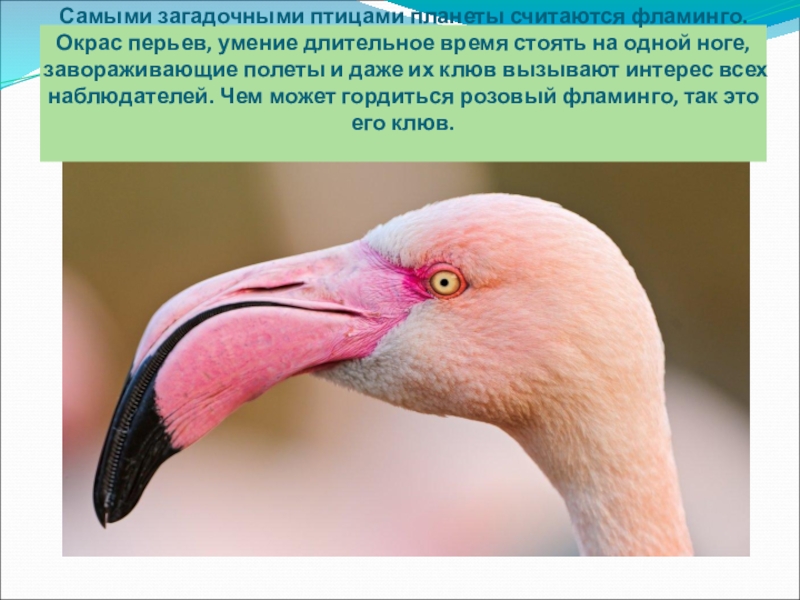 Слайд 3Самыми загадочными птицами планеты считаются фламинго. Окрас перьев, умение длительное время