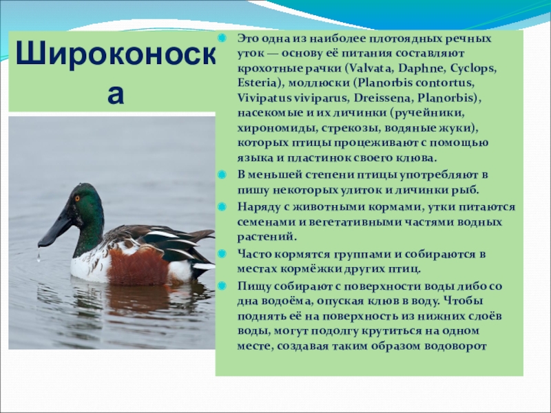 Это одна из наиболее плотоядных речных уток — основу её питания